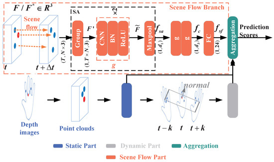 - Scene flow branch (orange): The scene flow dataset generated in Section 3.1 is used as input to the deep learning network, which is designed to predict gesture classes using fine-grained motion features.