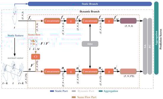 The architecture of T-FSS-GR is shown in Figure 4. The static feature is a coordinate vector that represents static space based on the depth images. The normal vector is a multi-dimensional vector that represents local motion features based on the static feature, so it is essentially a feature learned from the depth images. In order to take into account skeletons and depth images with complementary information, the scene flow (orange) is fused with a static feature and normal vector.