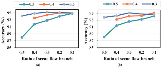 Accuracy (%) of multi-stream FSS-GR under different scene flow branch ratio on SHREC’17.