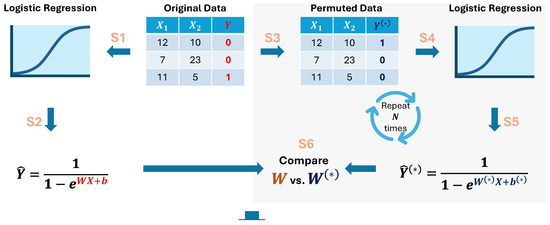 - Coefficient comparison (S6): Compare each coefficient of the permuted model to the coefficient ; here, || > || means that the association between and a randomly shuffled Y is more extreme than the that in the original data. Lastly, the empirical p-value for feature is computed as follows:with being a count function.