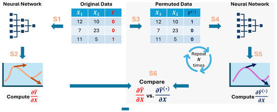 - Permuted gradient computation (S5): For each neural network , calculate the partial gradient for each feature , then obtain the test statistics for using Equation (2).