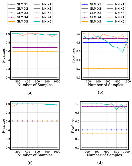 For regression, from Figure 4a,b it can be observed that the results are consistent through all permutations and that there is not much difference in the results with an increasing number of permutations. The same is true for both the linear and nonlinear cases. The p-values for neural network are consistently higher than those of linear regression for completely random features, meaning that the neural network can identify random features even better compared to linear regression. For linear regression, the p-value for polynomial association (feature ) is quite large at around , and completely fails to identify polynomial association. However, the neural network always identifies as a highly significant feature with a p-value of 0. In classification, Figure 4c,d shows similar results. In this case, the p-value for polynomial association (feature ) is around 0.4 for logistic regression. However, the neural network identifies as an important feature with a p-value of 0 for all numbers of permutations.