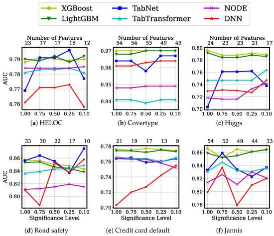 Similarly, for the credit card default data (Figure 5e), although the actual names of the features are not disclosed here, we began with all features and compared the model’s performance at various levels of significance, thereby maintaining a parsimonious yet meaningful feature set. We observed performance results similar to those obtained on the HELOC dataset. Remarkably, we achieved better performance with only nine features than when using all 21 features. These findings can enable decision-makers to make more informed decisions.