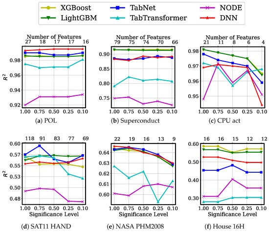 The results for the models on the regression task are presented in Figure 6. These results further reinforce the effectiveness of our feature significance test. On the CPU act and NASA PHM2008 datasets, there are slight drops in performance (about in ) with significant reductions in the number of features (4 of 21 features on the CPU act dataset and 9 of 22 on the NASA PHM2008 dataset). On all other datasets, all models demonstrated that a parsimonious yet meaningful feature set can preserve or boost the compared to models trained with all features. The consistency of the results throughout all the models and across all the datasets showcases the effective learning and generalization capabilities of the proposed method.