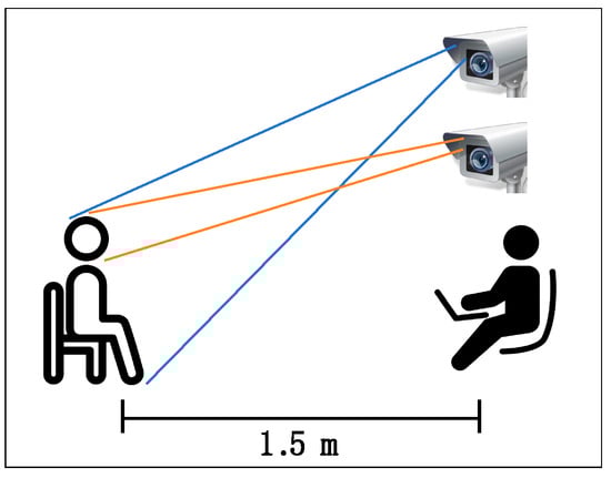 During the participant’s communication expression period, we utilized a high-definition camera with 1080P resolution and a 25 Hz frame rate to accurately capture participants’ facial expressions and body activities. The camera model was Hikvision DS-2CE16D8T-IT3F (Hangzhou, China), equipped with 5–50 mm autofocus, ensuring clarity of the images. To minimize any impact on participants’ natural reactions, the camera was positioned more than 1 m away. Throughout the session, continuous recording was conducted, and data were immediately uploaded to the cloud to prevent loss due to interruptions. The examiner used open-ended questions to facilitate free expression and emotional sharing, simulating a real conversation environment. The video recording setup is shown in Figure 1.