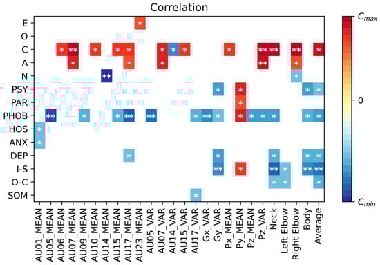 Among the Big Five personality traits, Conscientiousness shows significant correlations with multiple facial and bodily features, notably positive correlations with the means of AU06 (p < 0.05), AU07 (p < 0.01), AU10 (p < 0.05), AU15 (p < 0.05), and AU17 (p < 0.05), and with the variances of AU07 (p < 0.05) and AU15 (p < 0.05). It negatively correlates with the variance of AU14 (p < 0.05) and positively with the mean of Px (p < 0.05) and the variance of Pz (p < 0.01), as well as significantly with the Neck (p < 0.01) and Right Elbow (p < 0.01). Neuroticism, Agreeableness, and Extraversion each show significant correlations with different AUs and body activities’ intensities.