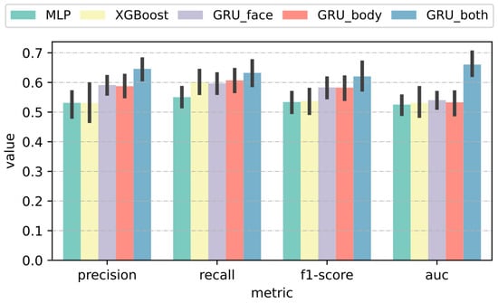 This research report presents the performance of models in terms of the precision (P), the recall (R), the f1-score (F1), and the AUC metrics. As shown in Table 4 and Figure 4, when comparing the prediction results of three models, the GRU model, which predicts psychological factors such as personality traits and psychological symptoms through analyzing dynamic features of faces and bodies, exhibits the best model efficacy (AUC = 0.736, P = 0.714, R = 0.714, F1 = 0.71). Notably, the GRU dual-modality model surpasses the single-modality model in predictive performance. In predicting psychological factors, the GRU dual-modality model achieves an AUC of 0.736, outperforming the MLP and XGB models, which yield AUC values of 0.584 and 0.625, respectively. Similarly, the GRU dual-modality model achieves an F1 score of 0.71, exceeding the MLP and XGB models, which obtain F1 scores of 0.601 and 0.616, respectively. In terms of recall, the GRU dual-modality model achieves 0.714, surpassing the MLP and XGB models, which achieve recall rates of 0.614 and 0.680, respectively. Likewise, in precision, the GRU dual-modality model achieves 0.714, outperforming the MLP and XGB models, which achieve precision rates of 0.612 and 0.649, respectively.