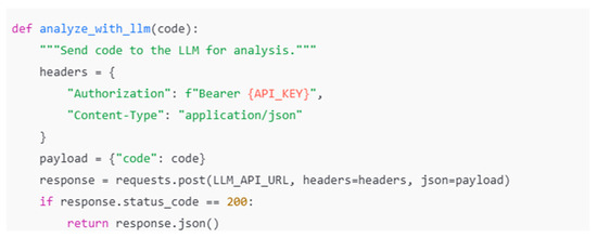 In the second stage, high-risk changes are analyzed using a Large Language Model (LLM) deployed via an API. The script (llm_analysis.py) sends code snippets to the LLM for semantic evaluation, detecting vulnerabilities like the God Object or insecure input handling. The LLM generates detailed reports with identified issues and recommended mitigations, stored in a JSON format for further developer review. This deep analysis leverages the LLM’s contextual understanding, reducing false positives compared to traditional tools (See Figure 5).