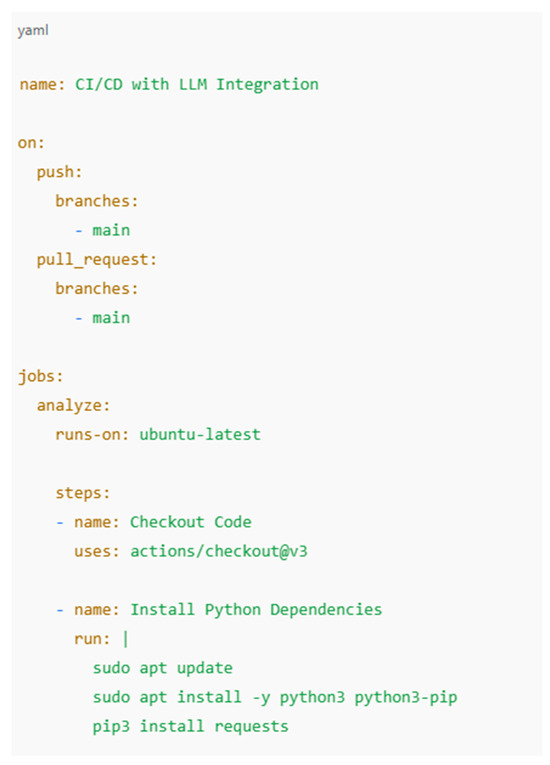 To ensure security and scalability, the framework incorporates authentication mechanisms and HTTPS for secure communication with the LLM API. For connecting to modern CI/CD workflows, a yaml script could be used, which will allow the integration with Jenkins, GitHub, and other CI/CD tools (see Figure 6).