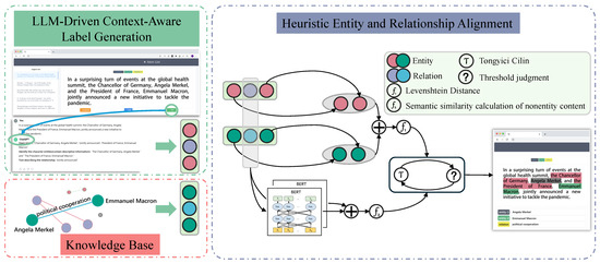 In the LoRE framework, RE in low-resource settings is achieved by combining distant supervision with LLMs. Initially, texts are annotated based on a pre-constructed knowledge base of entity relations. LLMs are then employed for OpenIE to autonomously identify entities and relationships. Entity alignment uses Levenshtein Distance, while relationship alignment relies on semantic similarity calculations, further refined by TongYiCi CiLin for semantic disambiguation. Semantic disambiguation refers to the process of resolving the ambiguity of words or phrases by identifying their intended meaning in a given context. TongYiCi CiLin provides a structured lexical resource that facilitates this process by aligning words with predefined semantic categories. This approach enhances the accuracy and reliability of alignment, as illustrated in Figure 1.