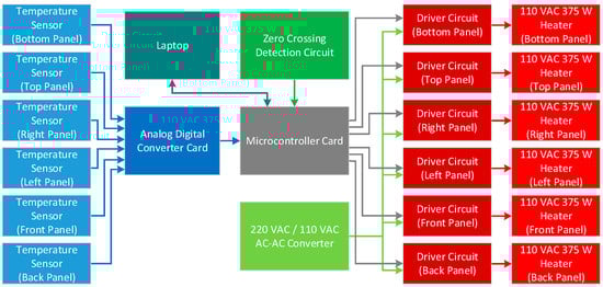 Control: The control signal for each panel was determined based on the selected control method (on-off, P, PI, or PID). The temperatures of the six panels were maintained at the reference values using six independent control loops. In the on-off control, control signals were generated using Equation (6):