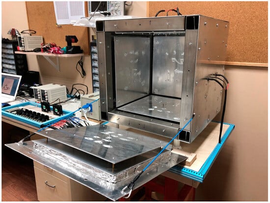 The mechanical component of the electric furnace was produced in three stages. In the first stage, the main body of the furnace was constructed as a cube measuring 60 cm × 60 cm × 60 cm, composed of four aluminum profiles measuring 60 cm × 5 cm × 5 cm and twelve profiles measuring 50 cm × 5 cm × 50 cm. Subsequently, the panels of the electric furnace were formed using aluminum plates measuring 60 cm × 60 cm, with each panel consisting of five layers. The first layer included an aluminum plate measuring 45 cm × 45 cm × 0.3 cm, designed to radiate heat generated by the resistance element. The second layer contained a 375 W heater (Baykal Rezistans Ltd. Co., Sakarya, Türkiye) and a PT100 temperature sensor (JUMO Process Control, Inc., Syracuse, NY, USA). The third layer consisted of another aluminum plate measuring 45 cm × 45 cm × 0.3 cm, which was fixed to the second layer with a copper spacer measuring 2 cm in height. The fourth layer was filled with rock wool, measuring 2.2 cm thick, capable of withstanding temperatures up to 750 °C to provide thermal insulation. Finally, a fifth layer comprised an aluminum plate measuring 60 cm × 60 cm × 0.3 cm, forming the outer surface of the oven. The mechanical assembly of the electric furnace was completed by combining these panels and components. Figure 3 provides a general view of the oven.