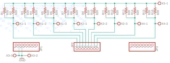 The ADC card digitally converted the temperature detected by the PT100 sensor. Temperature variations in the resistors led to changes in the resistance of the PT100 sensor. These resistance changes were converted into voltage changes by using the ADC interface card. Subsequently, this voltage change was digitized using an Arduino Mega microcontroller card and transferred to a laptop via the USB port. A schematic diagram of the ADC interface card is shown in Figure 4.