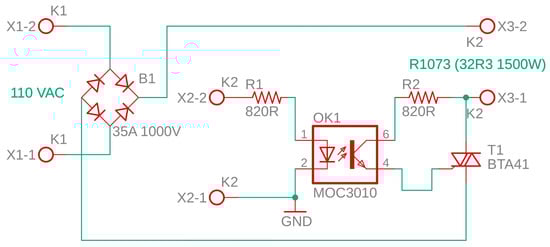 Resistance heaters with a power of 375 W were placed on each surface of the electric furnace to ensure homogeneous heating. The resistance heaters were independently controlled by pulse-width-modulated (PWM) trigger signals. Trigger signals were provided by a microcontroller card in 1 ms steps in a 100 ms period. The trigger signal and zero-crossing detection circuit were operated simultaneously to prevent interference from potential disturbances in the network. A schematic of the zero-crossing circuit is shown in Figure 5. Zero-crossings of the network frequency were detected using an H11L1 integrated circuit. The supply voltage required for the operation of H11L1 is provided by a 2 W transformer, 1.5 A bridge diode, and a 12 VDC supply regulated by an LM7805 linear voltage regulator and its peripheral components. The H11L1 generates a pulse with an amplitude of 5 V and a width of 500 μs for each zero crossing.