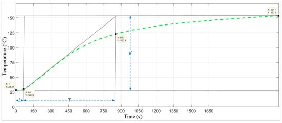 where K is the steady-state gain, L is the time delay, and T is the time constant. From the graph in Figure 8, K = 125.23, T = 789, and L = 64 are obtained. Using these values, the system model was determined, as given in Equation (14).