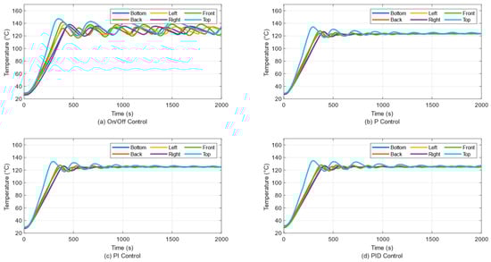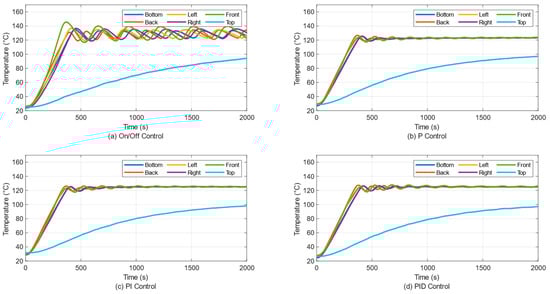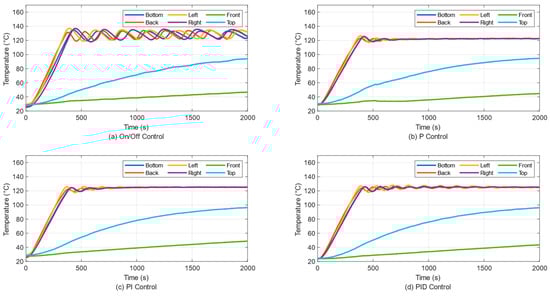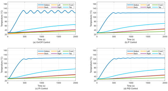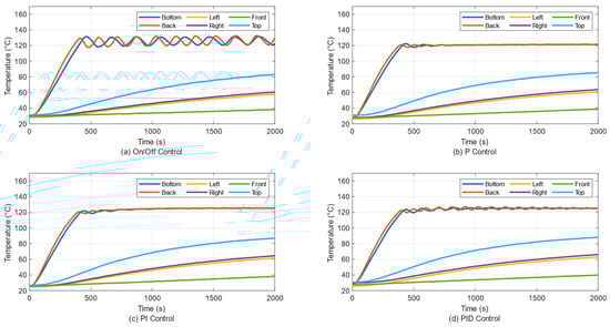 When the bottom and rear panels were energized, the PI and PID controllers maintained temperature control at the reference value, as shown in Figure 12. Due to its greater geometric distance from the energized panels, the front panel experienced the least temperature change (less than 10 °C). The right and left panels, equidistant from the bottom and rear panels, respectively, showed a moderate temperature change (less than 35 °C). The top panel, owing to the rising heated air, experienced the most significant temperature change (less than 60 °C).