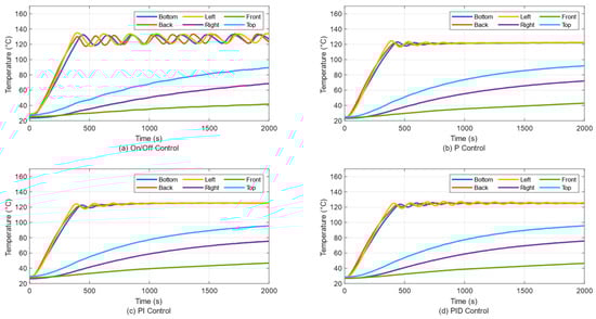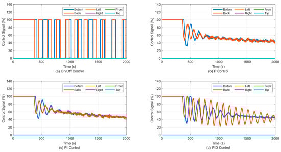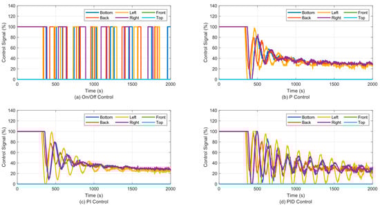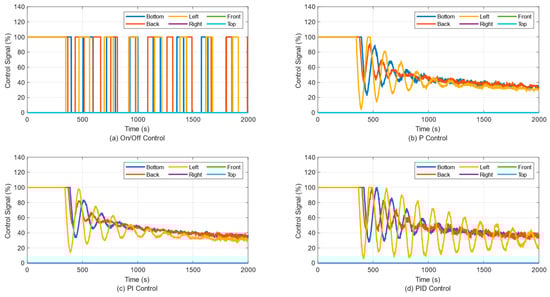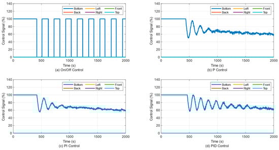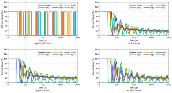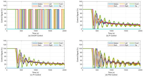 The temperature changes of the panels when the bottom, back, left, and right, and front panels were energized are shown in Figure 18, while the control signals applied to the panels are shown in Figure 19. Similarly, under the on-off control, the panel temperatures fluctuated around the reference temperature, and the system did not stabilize. However, with PI, and PID control, the panel temperatures approached the reference value with a steady-state error of less than 0.4 °C, achieving system stability.