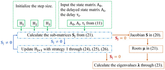 Note that the solution of the characteristic Equation (19) is transcendental, which means that there will be infinitely many roots, typically we are only able to determine a subset of the approximated numerical solutions. To overcome the difficulty of computational complexity and solve the eigenvalues efficiently and accurately, an adaptive step size linear multiple step size method (AS-LMS) is proposed below.