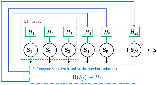 Note that the step size is updated according to a function . The function , as shown in (33), (34) and (35), describes the relationship between each and using the relationship information to adjust . Two examples of such functions are provided in this section, the first strategy is to update based on the calculated solution at the current step with respect to the first step as shown in (34), the second strategy is to update based on the calculated solution at the current step with respect to its previous step as shown in (36). Figure 1 visually demonstrates how the equations are solved using Strategy 1 in the AS-LMS. Figure 2 visualizes the logic of updating the step size, illustrating the evolution of the step size over three time steps as an example.
