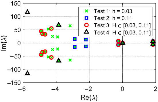 - Fixed h = : The eigenvalues computed using a small fixed step size of h = serve as a benchmark for eigenvalue accuracy, including the number of eigenvalues captured. The number of system matrix from (25) becomes 39, i.e., = 39, which reflects the computational burden. The relatively small step size provides a more accurate approximation of the eigenvalues but incurs a higher computational cost due to the larger matrix size when compared to the following cases.