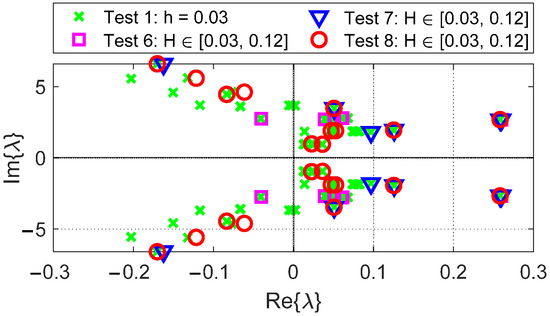 - Adaptive with strategy 1: Test 6 implements an adaptive step size with a range of . The number of system matrix from (28) becomes 14, i.e., = 14. This test provides the most comprehensive eigenvalue captures after Test 1, striking a good balance between computational efficiency and accuracy. The rightmost eigenvalues are captured, and the number of non-rightmost eigenvalues captured is higher than in the previous tests.