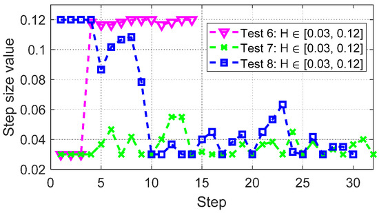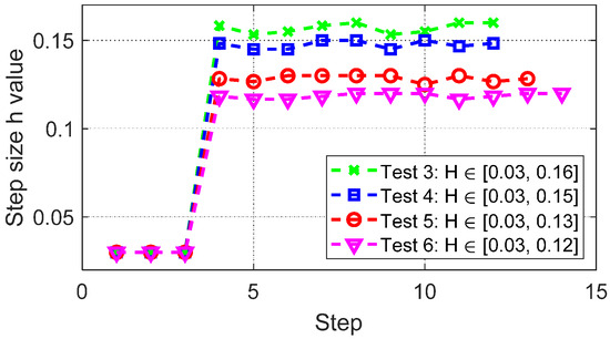 - Initialize the method: Start by choosing an initial step size from , where and are pre-defined values depending on the requirements and characteristics of the problem being solved. Define as the step size increment.
