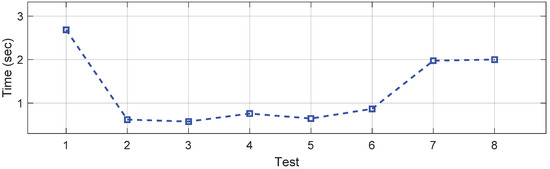 Figure 9 illustrates the execution time for each test that is conducted on the IEEE 30-bus testing system. Test 1 has the longest execution time, which is expected given its smallest step size. The results of Tests 2, 3, and 4 are not discussed in detail because their step-size selection does not yield optimal performance due to inappropriate settings. These tests are included primarily for demonstration purposes, illustrating the potential consequences of selecting inappropriate step size settings. Test 5, 6, 7, and 8 demonstrate significantly decreased execution times compared to Test 1. The execution time for Tests 5, 6, and 7 increases as the problem size increases, i.e., as becomes larger. Tests 7 and 8 exhibit similar execution times, as their only difference lies in the initial step size. Tests employed with the AS-LMS demonstrate a significant advantage in saving computational time while still successfully capturing the rightmost eigenvalues.