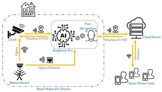 - Majumder, A.J.; Izaguirre, J.A. A Smart IoT Security System for Smart-Home Using Motion Detection and Facial Recognition. In Proceedings of the 2020 IEEE 44th Annual Computers, Software, and Applications Conference (COMPSAC), Madrid, Spain, 13–17 July 2020; pp. 1065–1071. [Google Scholar] [CrossRef]