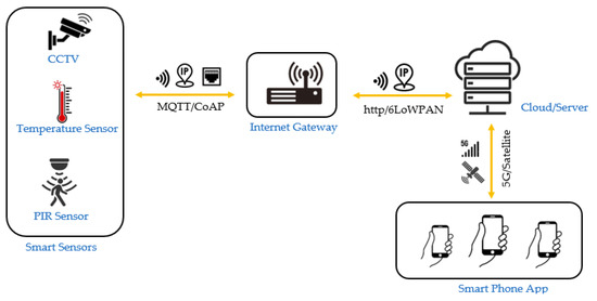 Internet of Things (IoT) is the vast array of physical objects equipped with sensors and software that enable them to interact with little human intervention by collecting and exchanging data via a network [59]. IoT technology comprises essential hardware, IP, tools, systems, sensors, and software that enable the creation of smart devices, ranging from medical equipment to industrial machinery. It also includes security features to protect these connected devices from online threats. The IoT working principles are depicted in Figure 3. The IoT technology elements utilized in realizing the presented application are described in the following sections.