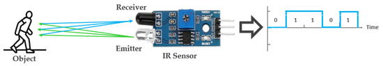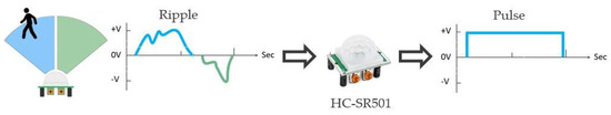 The sensor selected for the security system was the passive infrared sensor (PIR). It works on the principle of the Pyroelectric Effect, as modeled in Equation (1) below [60]. PIR sensors detect infrared radiation emitted by all objects that generate heat. The advantage of PIR sensors lies in their method of detecting differential heat energy. They detect motion by measuring changes in infrared radiation across their two separate sensing elements. When an IR-emitting object crosses the sensing element path, the first element measures it and generates a HIGH signal. When the object crosses the second element’s path, the element generates a LOW signal. On detecting a large difference between the signals from the two sensing elements, the sensor outputs a HIGH signal, as shown in Figure 4. This enables the sensor to respond specifically to the heat emitted by a person, making it less susceptible to false signals from non-heat-based movements, such as wind. However, a limitation of PIR sensors is their likelihood of being triggered by animals, a challenge also common to other types of sensors. They are “passive” since they do not emit any heat or energy themselves. It is crucial to note that PIR sensors respond to infrared radiation, not to heat directly.