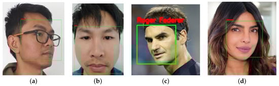 Recognized face with an identity label and unrecognized face. (a) user “TTu”; (b) user “SPh”; (c) “R. Federer”; (d) “Unknown”.