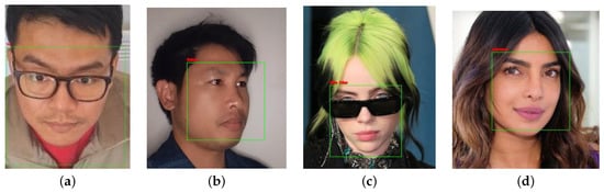- Face Landmark Detection: Dlib’s facial landmark detection model uses key facial points, including the right and left eyebrows, eyes, nose, and jaw, to precisely localize and represent important regions of the face. The model utilizes a 68-point landmark system, which allows it to detect these critical facial features with high accuracy. This process plays an essential role in tasks like face alignment and recognition, contributing to robust performance across various conditions such as facial variations and lighting changes [64,65].