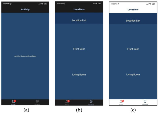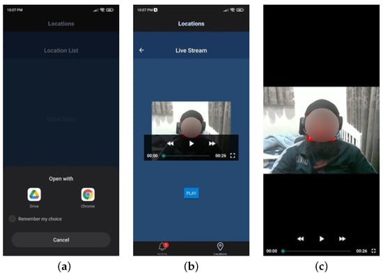 Ideally, the entire notification system and video footage viewing functionality would be integrated into a dedicated application. For this purpose, an application was developed using the JavaScript programming language and the React Native framework. React Native, which is widely utilized in popular applications such as Facebook and Uber Eats, was chosen due to its cross-platform compatibility with Android, iOS, and web platforms. Additionally, React Native offers a range of libraries that facilitate development, including React Navigation, heavily utilized to implement the desired user interface and tab structure, and Expo AV, which supports in-app video playback. The development process also incorporated tools and services such as Expo and Visual Studio Code. Expo proved particularly useful during the development cycle, enabling the application to be run on an Android device via a local area network and updated in real time. This feature significantly enhanced the efficiency of interface design and testing. The application’s tabbed interface was implemented using the React Navigation Bottom Tab Navigator combined with the Native Stack Navigator. The bottom tab navigator defines the names, titles, styles, and icons for each tab, with icons dynamically changing their appearance upon selection. Additionally, a native stack was employed for the in-app video player, allowing a secondary navigation layer within an existing bottom tab. This feature enables greater customization of the video player screen, accessible through the “Locations” tab by selecting a specific location. The “Locations” tab demonstrates two distinct methods for accessing recorded footage as a proof of concept. The first method employs Linking openURL to open the user’s Google Drive in an external browser. This approach leverages Google Drive’s inherent security, requiring the user to sign in to access the content, ensuring a secure connection. The second method utilizes the aforementioned video stack for in-app playback. In this implementation, a button press navigates to the LiveStreamScreen stack and passes the corresponding video URL as a route parameter. By linking the route parameter to the button, multiple buttons with distinct video URLs can utilize the same LiveStreamScreen function for video playback. In a fully realized implementation, the video URL would automatically update to reflect the latest footage. However, significant security concerns associated with this approach necessitated alternative methods. Listing 4 illustrates the configuration of the video player, which accepts an input URL provided by the pressed button. The player supports full-screen mode and includes external pause and play controls, enhancing user interaction.