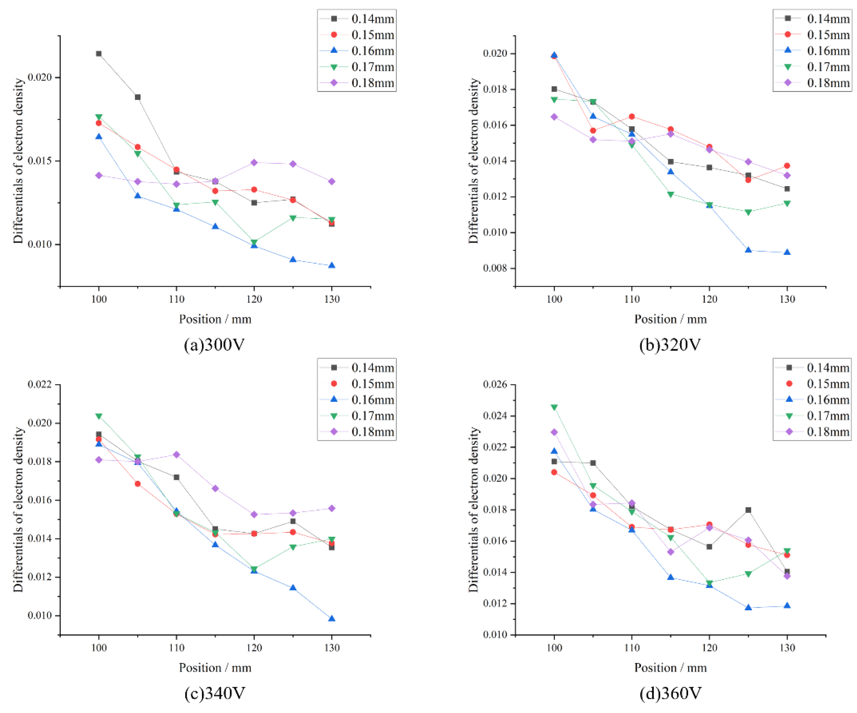 Relationship between the variation in emitted electron density and filament width at different anode voltages: (a) 300 V; (b) 320 V; (c) 340 V; (d) 360 V.