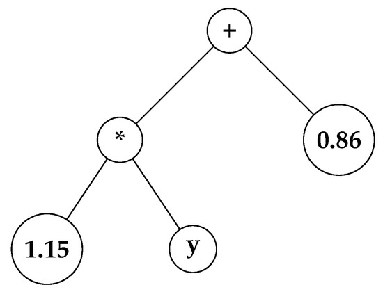 In [11], implementation, a genetic algorithm searches for potential equations with a multi-population evolution in a loop of evolve–simplify–optimize. Although real-value coefficients appear in the expressions, they are optimized using classical methods. The genetic algorithm is used to optimize the presence of operations, represented by integers. This way, symbolic regression is optimized, as discovering equations from data is complicated and time-consuming [11]. Figure 1 presents a tree-based representation of the expression , where ‘+’ and ‘*’ nodes are the binary operators of addition and multiplication, respectively. A “node” in a tree represents each operation and operand of an analytical expression. The default complexity used for the fittings in this article in PySR is the total number of nodes in the expression independently of its content [11].