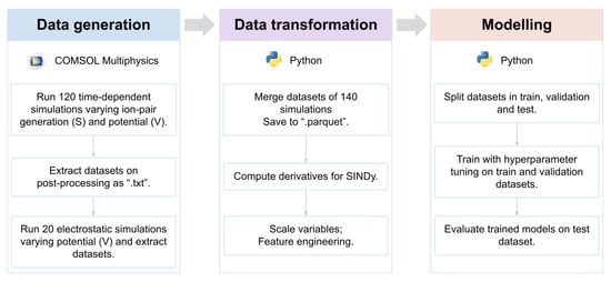 This section describes the steps performed in this work and details some important aspects of the methodology. The work can be split into three macro steps: data generation, transformation, and modeling. The flowchart in Figure 2 presents the steps and subtasks performed.