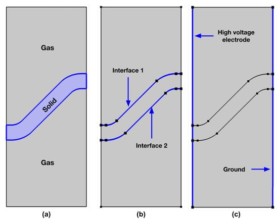 Axisymmetric geometry with conical insulator used in simulations. (a) Domains, (b) interfaces, (c) electrodes.