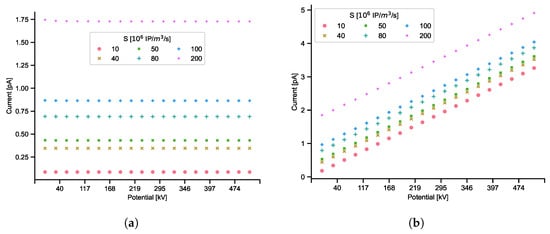 The results derived in [6] disagree with Equation (12) as the dark current increases with the increase in potential applied. Still, it is important to note that the model constructed by the authors is for air and for a different geometry, which does not incorporate the intricate dynamics of the flux in the boundary gas–solid insulator. The authors also observe the linear relation of radiation dosage related to the ion-pair generation rate and the dark current.