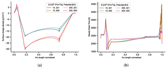 The analyzed dataset for dynamics was surface charge densities, so each sampled coordinate in the arc length of the gas–solid insulator interface had a computed time to reach the steady state. The maximum value calculated on the arc was used as the time to reach the steady state for each simulation.