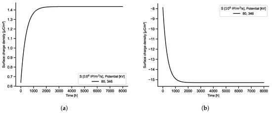 The dynamic of saturation of the surface charge density observed in Figure 6 is called capacitive-resistive transition, described in many previous papers [1,9] and expected. The charging of positive or negative particles is influenced by the geometry of the solid insulator interface and its proximity to the electrodes, as seen in Figure 5. The fast saturation behavior, observed in the curves on Figure 6, is related to neglecting the interface conductivity of the boundary, so all current from the gas that cannot be dissipated by the current in the solid insulator accumulates at the interface, as can be seen in Equation (1) excluding the last term. The geometry and distance from the electrode create specific points of accumulation on the boundary; the same preferred accumulation near the positive electrode of negative particles is observed in [9]. The varying time to steady state observed in Figure 5b is discussed and derived by [40] as well, although with a different method. As discussed previously, the linear increase in current in the solid with potential is expected and can be seen in Figure 4b.