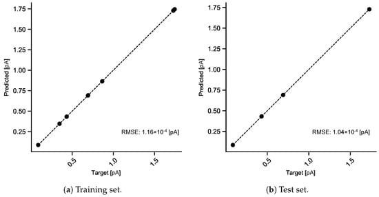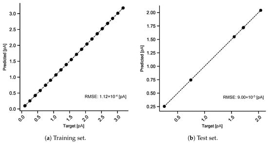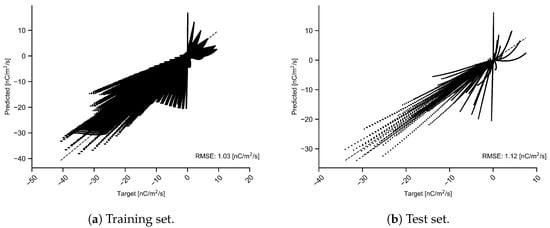 The final equation obtained is presented in Equation (17), where t is in hours, V is potential applied in kV, and is the electric field in V/m in the surface of interface 1 in the j-direction at time t; j= r, z. The model’s root mean squared test error is nC/m2/s, and Figure 11 presents the true vs. predicted value for the target using the learned modeling in the training and test sets.