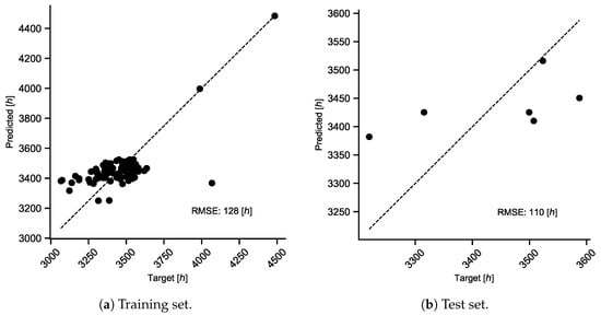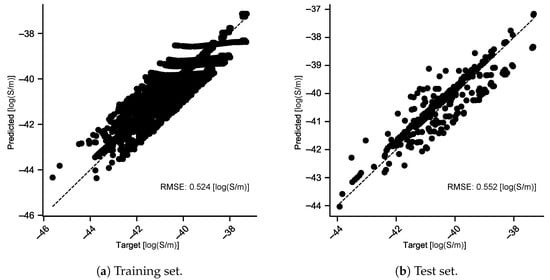 The root mean squared error for the test set of Equation (15) is log(S/m), and Figure 10 presents the true vs. predicted value for the target using the learned model for the training and test datasets.