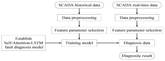 This paper introduces a self-attention–LSTM fault diagnosis methodology tailored for the yaw systems of wind turbines. Initially, the historical data collected by the SCADA system are preprocessed (which includes handling nulls and outliers), followed by feature dimensionality reduction. The resulting feature parameters are then divided into training and test sets. The training set is fed into the network model, and the network training parameters are adjusted. The test set is fed into the network model for testing, and the classification results are obtained to realize the fault diagnosis of the yaw system.
