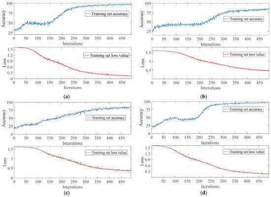 Experiment (1): LSTM network classification is used to realize fault diagnosis, sigmod is used as the activation function of LSTM, and 2 LSTM layers (each layer is 16 neurons), 2 dropout layers (the dropout rate is 20%), 1 fully connected layer and softmax layer are set, the maximum number of iterations is 490, and the learning rate is 0.01, the total number of layers in the model is 8 and the total number of participants is 3669. This method is denoted by “LSTM”.