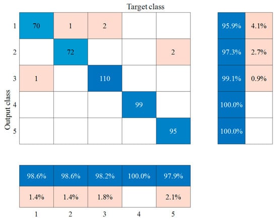 Figure 9. The confusion matrix of the model reveals an average recognition accuracy of 98.67% across the five states. Notably, the correct diagnosis rates for both yaw motor faults and yaw gearbox faults are perfect at 100%. The accuracy for the remaining three types, although slightly lower, still achieves a commendable minimum of 95.9%. This demonstrates that the wind turbine yaw system fault diagnosis method introduced in this paper can effectively and accurately identify the various fault states of the yaw system, given an adequate sample size.