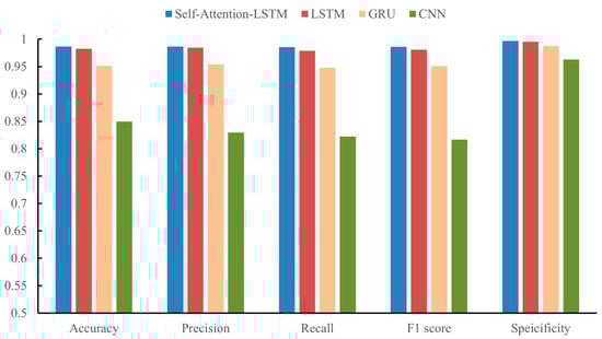 Figure 10. The diagnostic accuracies of the LSTM, GRU, and CNN models are 98.23%, 95.13%, and 84.96%, respectively, whereas the self-attention–LSTM model achieves a diagnostic accuracy of 98.67%.