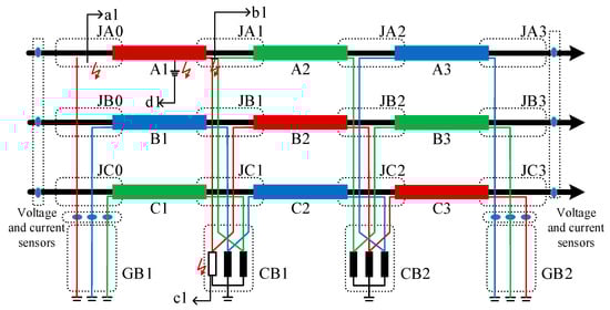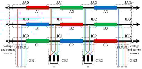 A structural diagram of a cross-bonded main section is shown in Figure 1, and the metal sheath is swapped between the cross-bonded boxes J1 and J2. jxy (x = A, B, C, y = 0, 1, 2, 3) denotes the metallic joints, and A1–C3 represents the main section of the cross-bonded cable, which is divided into nine smaller segments. The sensors are mounted on the cable core and sheath and are used to collect the voltage and current at the beginning terminal and terminal.