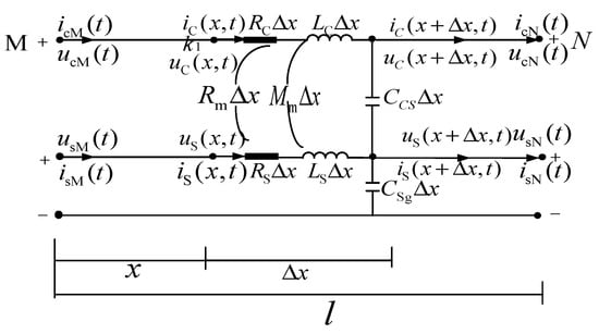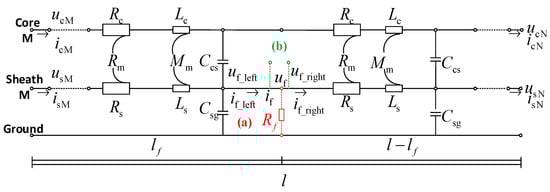 In Figure 2, , , , and , , , show the voltages and currents at the core and the sheath’s beginning and ending terminals at time , respectively. , , , and , are the unit self-resistance, self-inductance, mutual resistance, and mutual inductance of the core and sheath of the cable, respectively. and indicate the equivalent capacitance of the main insulation and the unit equivalent capacitance of the insulation between the sheath and the ground. Point is at a distance of from terminal . , and , are the currents and voltages in the core and sheath at point in time , respectively.