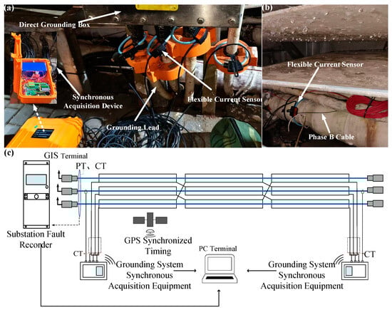 The fault recorder at the substation cannot only be activated when the line is faulted but also can be turned on manually, and both of them can record the three-phase currents in the line and the corresponding three-phase voltage waveforms of the busbar. In this experiment, the fault recorder is manually turned on at the substation to collect the U and I at the beginning terminal of the core, with a sampling frequency of 4 kHz and millisecond precision at the substation. In the cable, two direct grounding lines have access to flexible current sensors, a sampling frequency of 5 kHz, and a time accuracy of ± 100 ns. The two direct grounding box B-phase core currents and three-phase sheath currents (measured to the cable at both ends of the sheath voltage order of magnitude of millivolts, approximated to 0 V) are synchronized through the GPS synchronization equipment. The currents collected by the current sensor are the sheath currents at the beginning terminal and ending terminal of the cable and the B-phase core current. Figure 5 displays the substation line core electrical signal acquisition device, along with the grounding system sheath electrical signal synchronization acquisition device and measurement diagram.