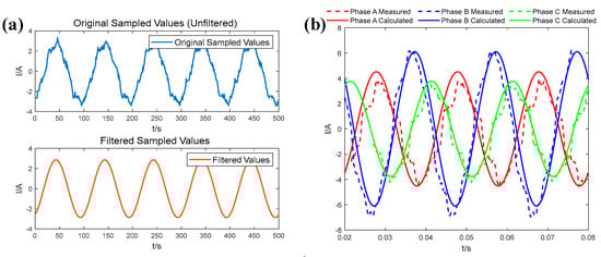To further minimize asynchronous errors in core and sheath measurements, the relative time between the phase B core current collected by the sheath measurement system and the peak point of the phase B core current collected by the core measurement system was used as the moving time of the other collected quantities of the core. The adaptive filtering method is used to filter the collected beginning terminal data. The A-phase sheath current can be used as an example, while the comparison graph before and after filtering is shown in Figure 6a. The three-phase sheath currents at the terminal are calculated using the cross-bonded cable distribution parameter model in Section 2.1, and the comparison between the actual measured and calculated values at the terminal is shown in Figure 6b. Under ideal operation conditions without defects in the grounding system, the sheath current is offset by three-phase sheath cross-interconnection. However, there are unavoidable situations in practice: (1) Cables arranged in positive triangles in order to transpose the sheath in the cross-connected interconnection box need to lead the sheath conductor through the coaxial cable in advance, and the coaxial cable at the coaxial cable is generally used in the form of a linear arrangement; (2) in one cross-bonded main section, multiple small cables are in a cross-bonded main segment, the length distribution of multiple small segments is unbalanced, and the induced current cannot be completely canceled. The average error of the three-phase terminal sheath current is 0.3164 A for phase A, 0.3415 A for phase B, and 0.3351 A for phase C, and the total average error is 0.3310 A, which is within the permissible range of actual working conditions. There is still a particular gap between the calculated and measured values, mainly because the engineering site is often more complex, and there are usually simplified parameters when calculating.